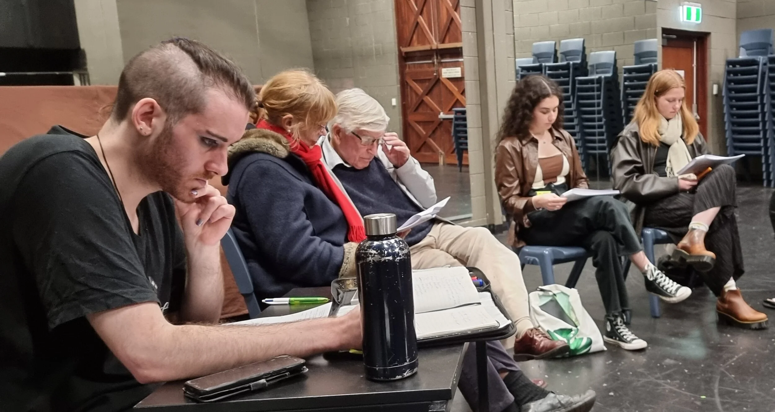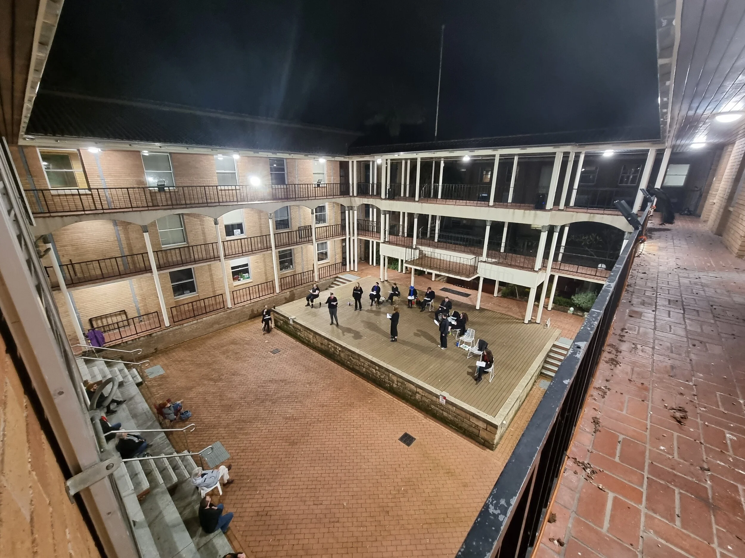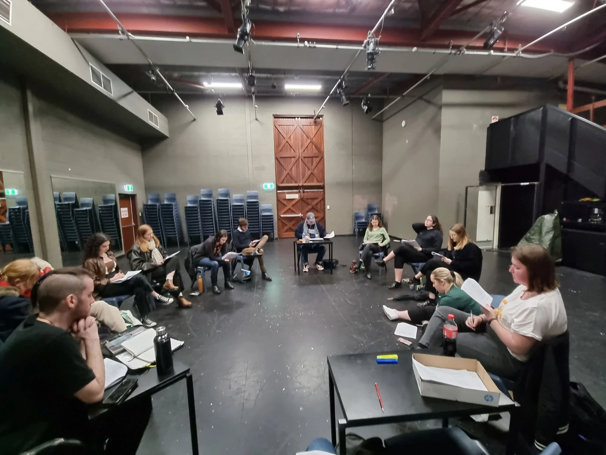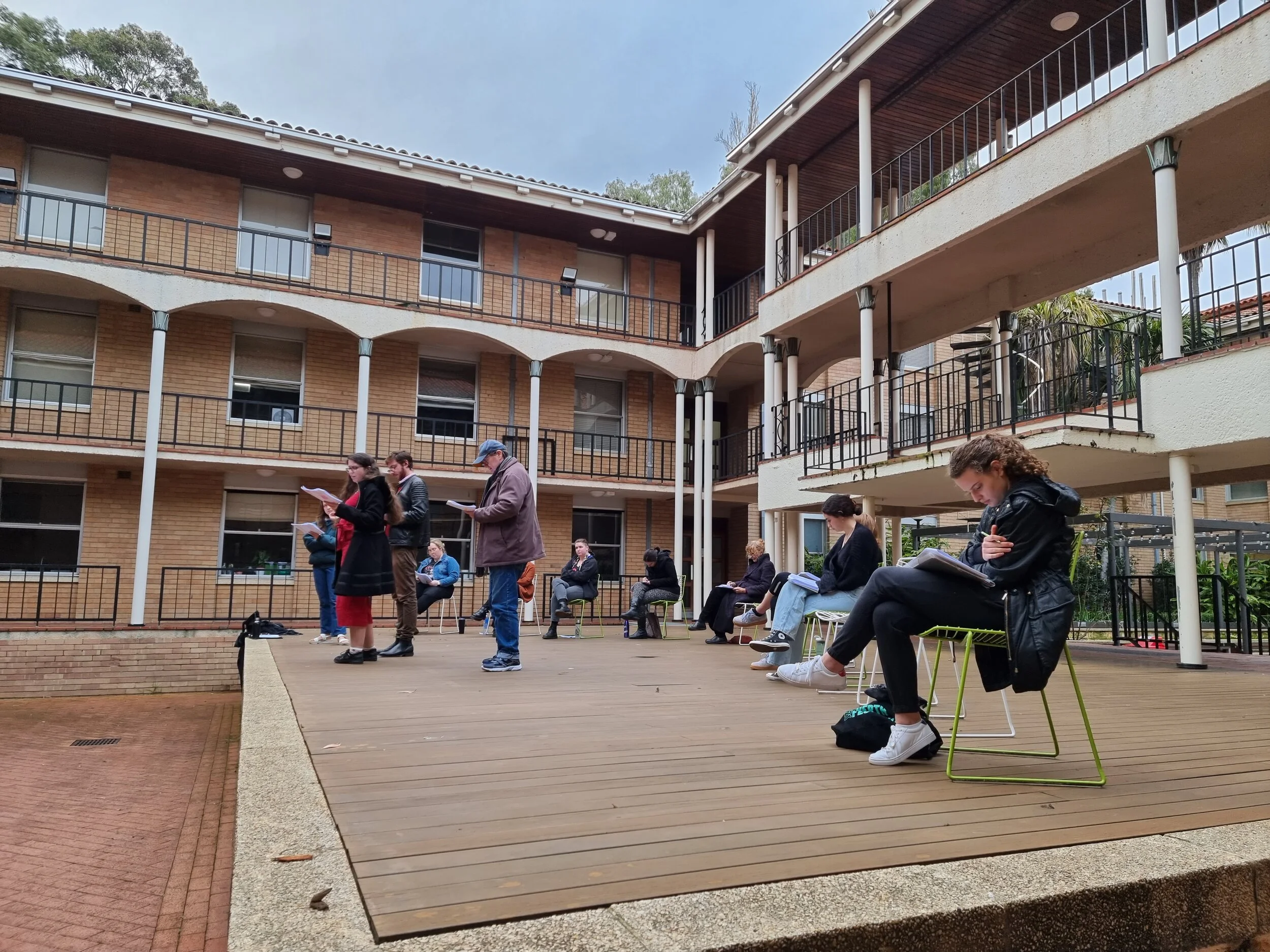 “Each cast member will have a seat for when they are not in character. These will be fanned across the border of upstage and centre stage, grouped according to the frequency with which character interact. From these rest positions, actors will stand when in role, moving downstage when their character is emotionally available to the audience, and moving (diagonally) toward other performers as their characters are actively interacting.”