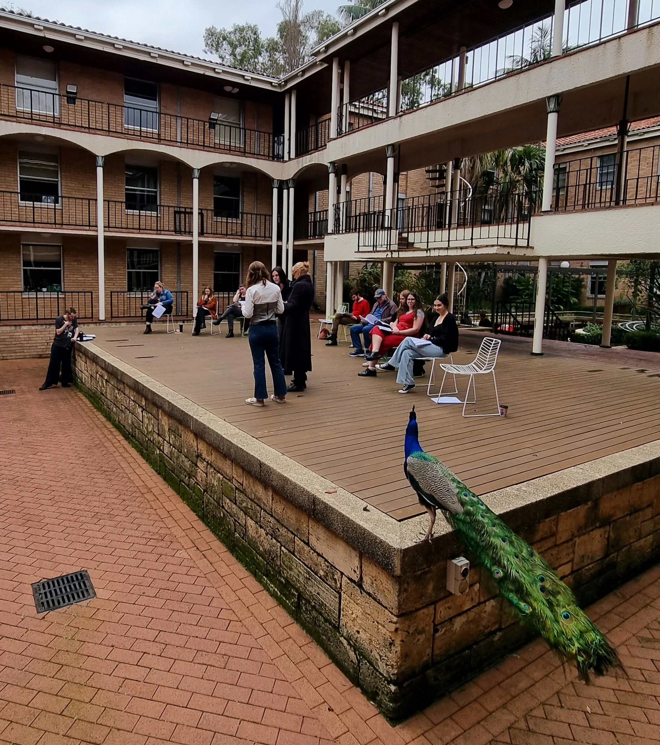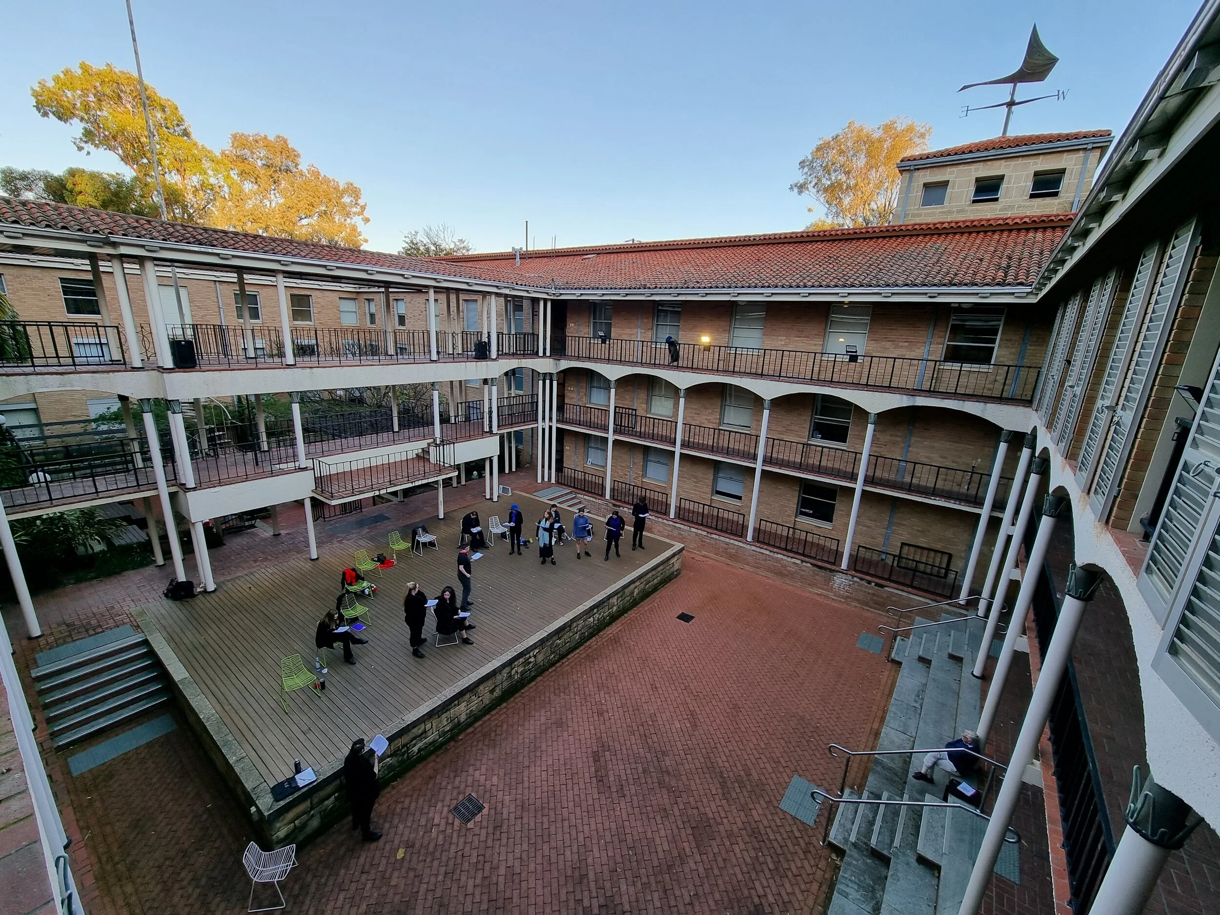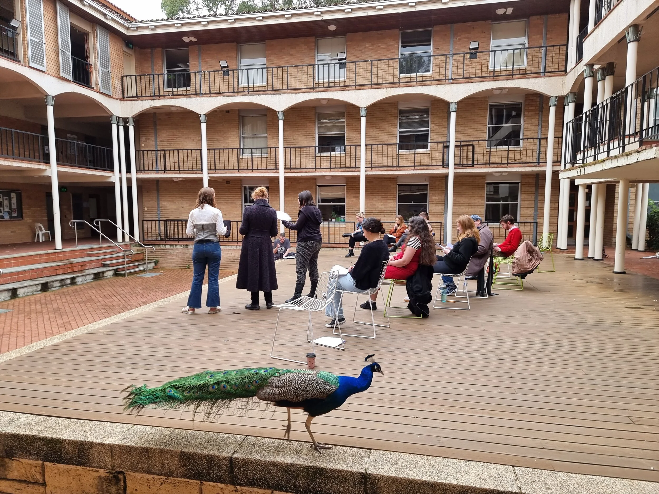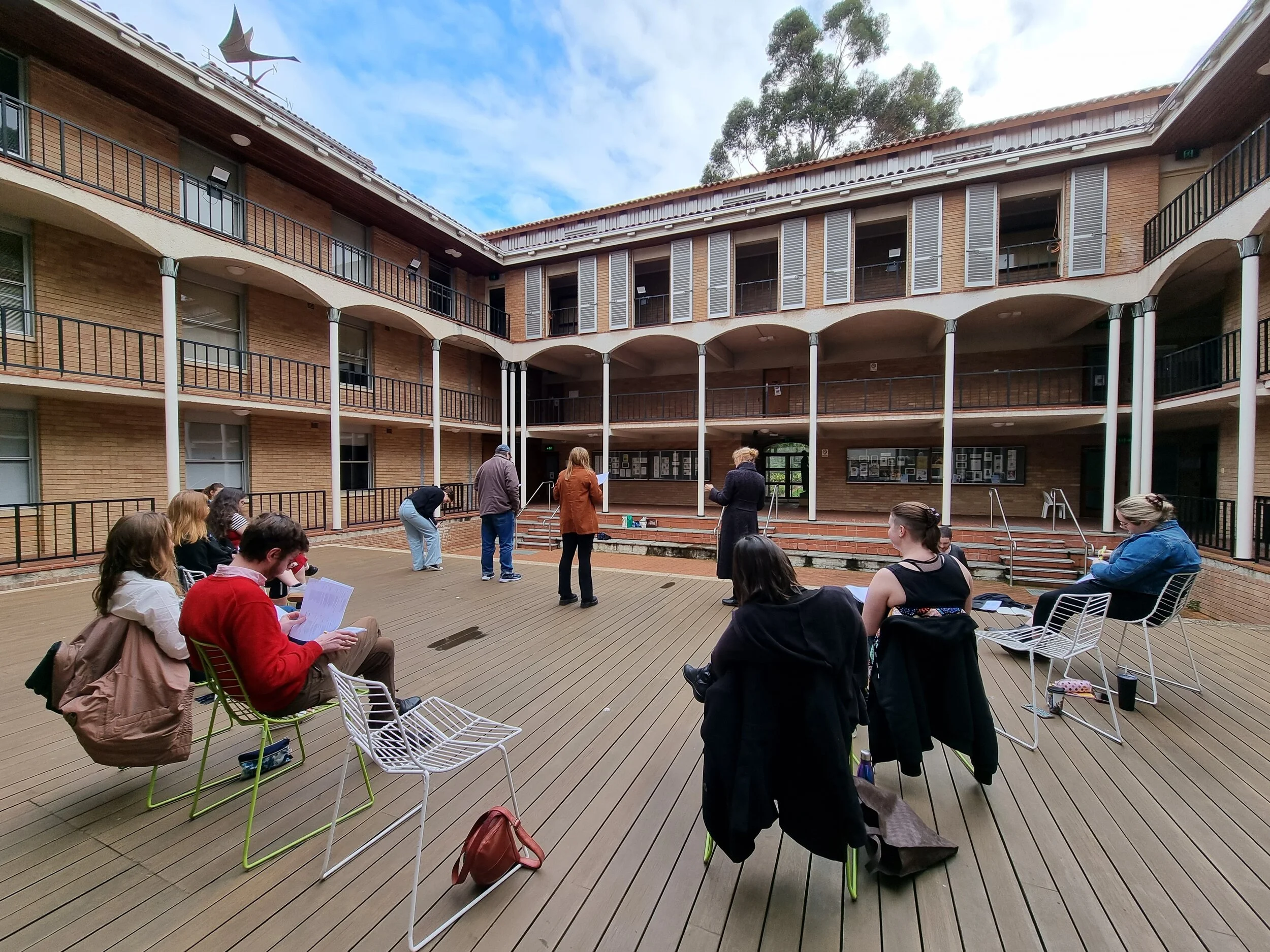 “Each cast member will have a seat for when they are not in character. These will be fanned across the border of upstage and centre stage, grouped according to the frequency with which character interact. From these rest positions, actors will stand when in role, moving downstage when their character is emotionally available to the audience, and moving (diagonally) toward other performers as their characters are actively interacting.”
